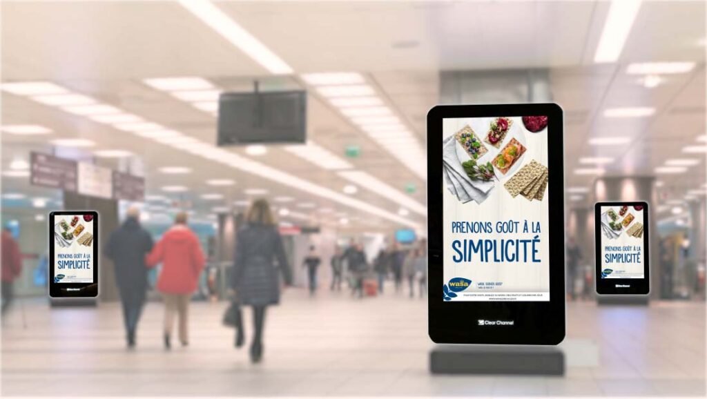 Consigne technique à respecter, adapter du spot à la taille de l’écran et à la distance moyenne de lecture : du grand écran dans le métro au petit écran au-dessus des caisses.